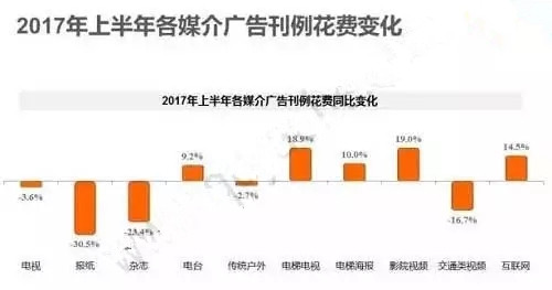 戶外媒體與“場(chǎng)景”和“場(chǎng)所”的連接成為決定其價(jià)值的重要因素。根據(jù)CTR媒介智訊《2017年上半年各媒介廣告刊例花費(fèi)變化》顯示,影院視頻、電梯海報(bào)、電梯電視成為了三種增長(zhǎng)最快的媒介形態(tài),而報(bào)紙、雜志和交通類視頻則是三種降幅最大的媒介形態(tài)。