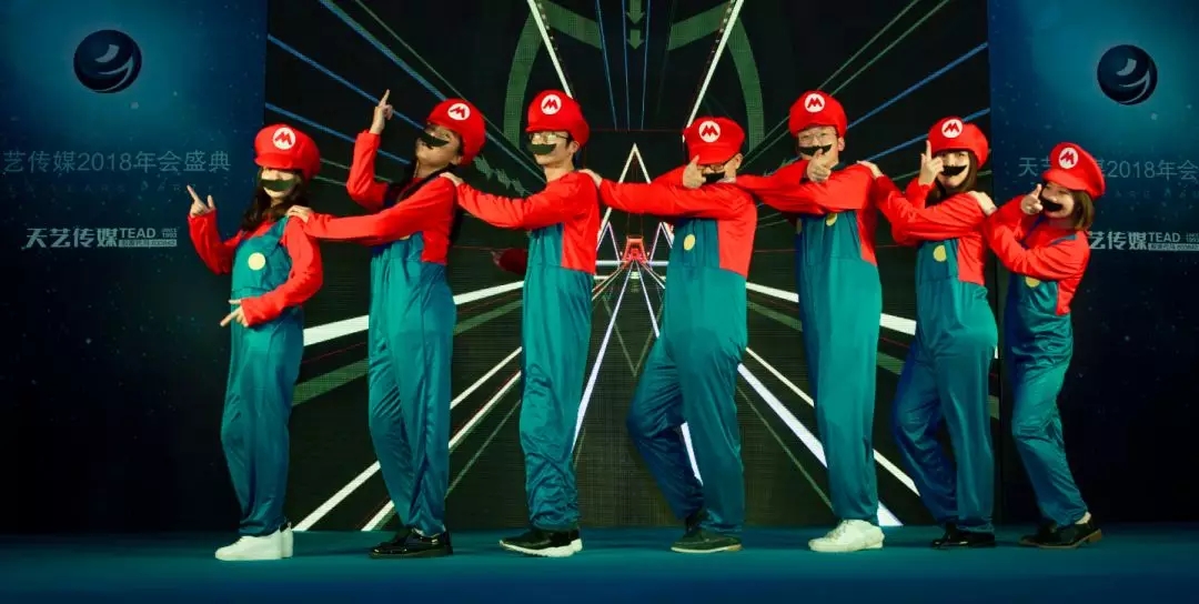 舞臺燈光驟然熄滅,再次點亮?xí)r,一群紅帽紅衣戴著大胡子的馬里奧“叔叔”出現(xiàn)啦!